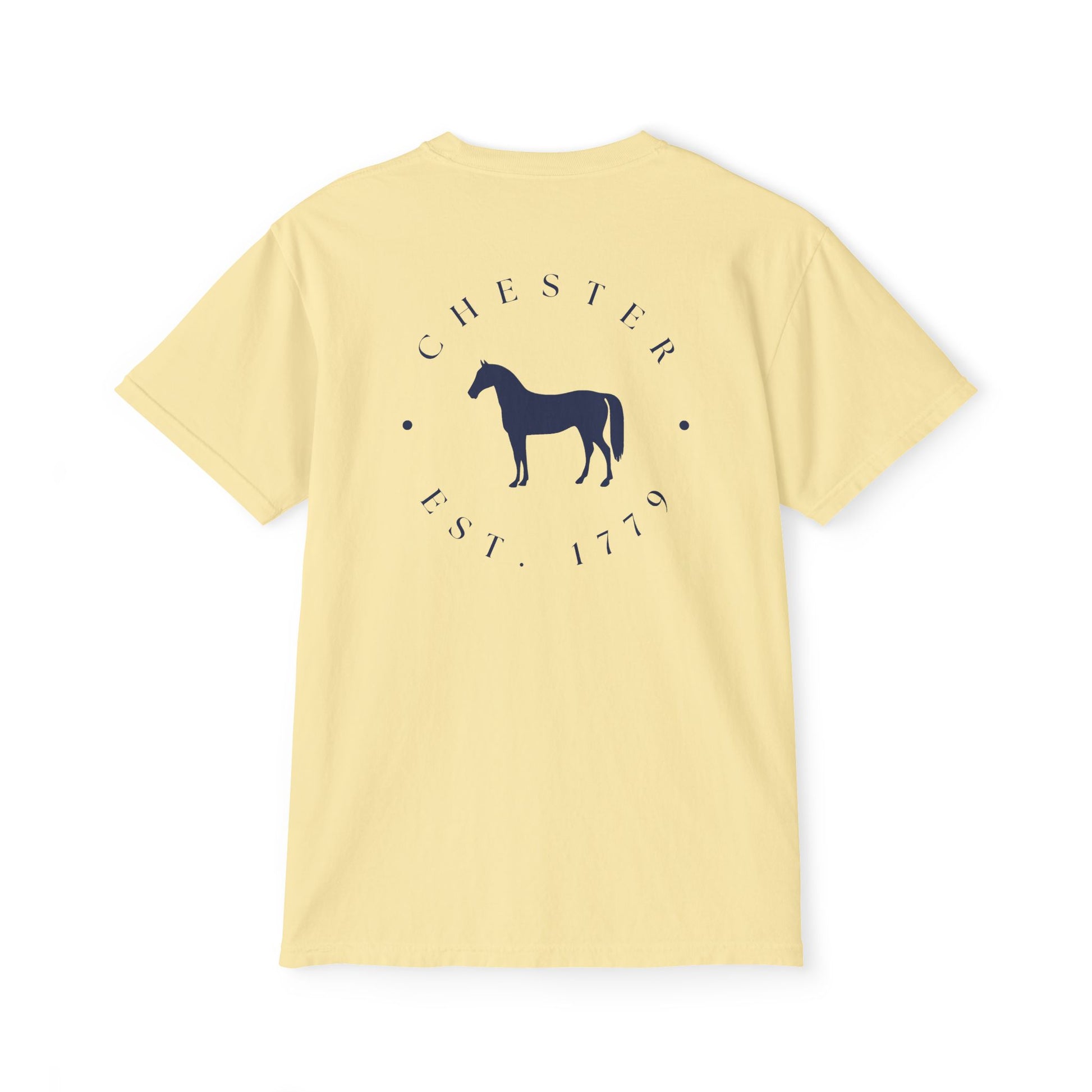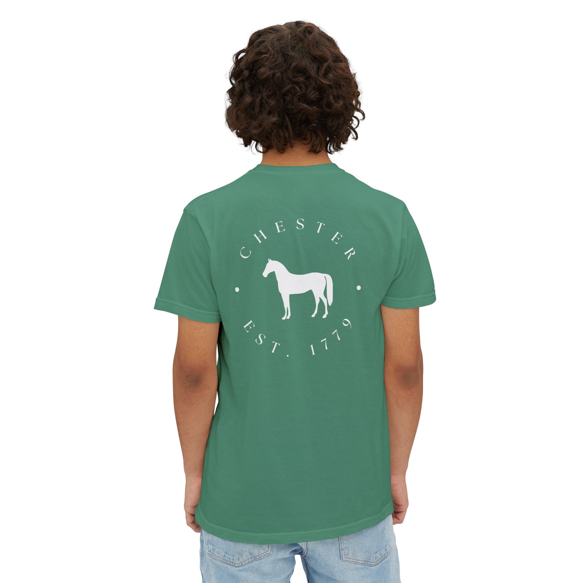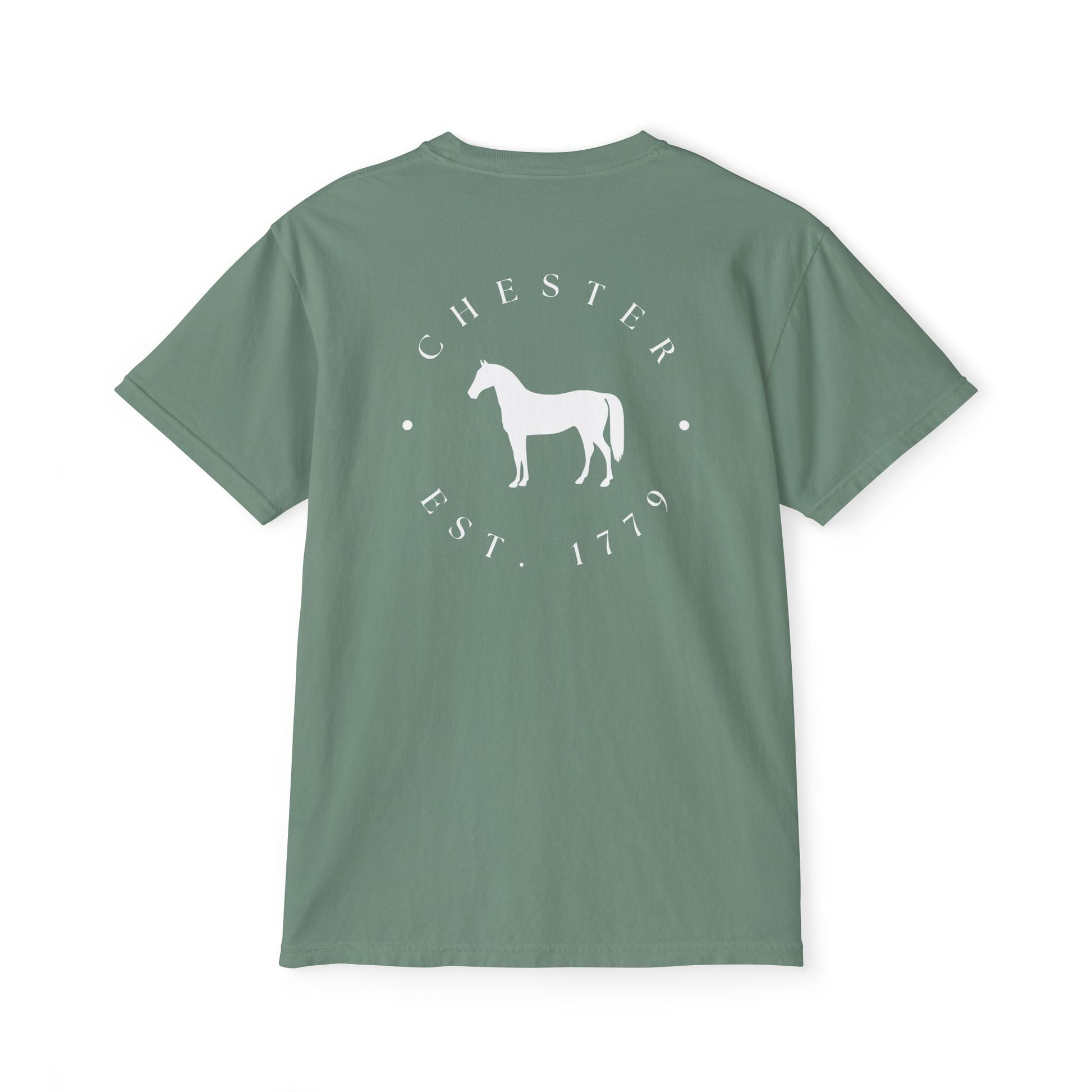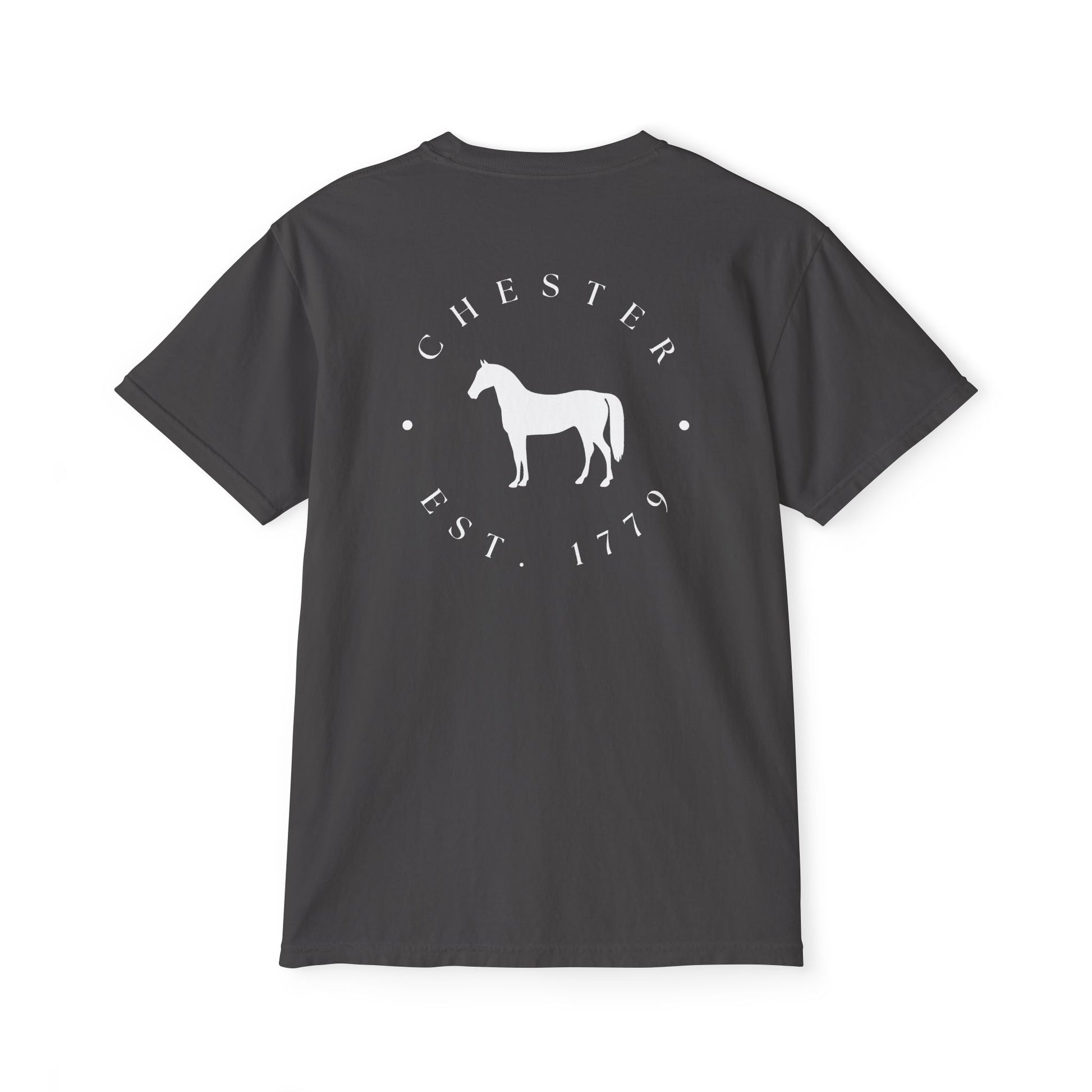 A timeless nod to Chester’s equestrian heritage, the Chester Equestrian Pocket Tee blends classic style with effortless comfort. Featuring a refined horse crest on the back and an understated “Chester” on the front pocket, this tee embodies the spirit of the town—where rolling pastures, historic charm, and an appreciation for the outdoors come together.